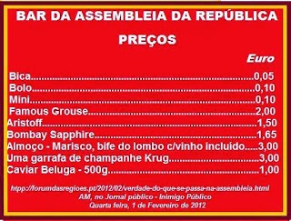 Quando as refeições escolares no Básico atingem os 3,80 o IP viu os preços do bar da A. R frequentado por deputados e ministros. Eram 8 da manhã e o repórter pediu um café e um bolo de arroz, tendo pago 15 cêntimos, 5 do café e 10 do bolo ! vendo ali mama da grossa, o repórter bebeu 10 minis, tendo pago 1 euro, pois cada mini custa 10 cêntimos.