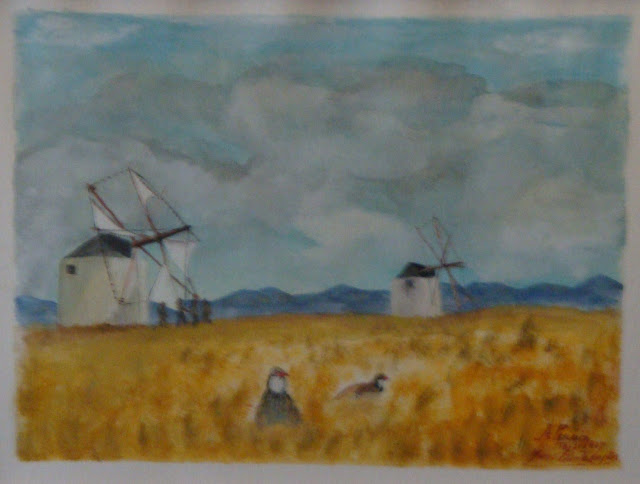 O melro é observado pelo gato numa atitude de desejo e posse. Se o consegue ou não, não o sei dizer visto ser a caça isso mesmo. Estes protagonistas estão rodeados de pomares de que sobressai a casinha dos arrumos. Serviu-me de base a esta ideia o quintal do meu vizinho.